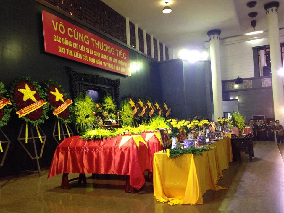 Di ảnh của 9 quân nhân được xếp thành hàng ngang trên hai chiếc bàn dài dưới dòng chữ "Vô cùng thương tiếc các đồng chí liệt sĩ hy sinh trong khi làm nhiệm vụ tìm kiếm cứu nạn". Phía sau là 9 vòng hoa mang hình cờ tổ quốc và giá đỡ 9 linh cữu xếp ngay ngắn phía trước di ảnh.