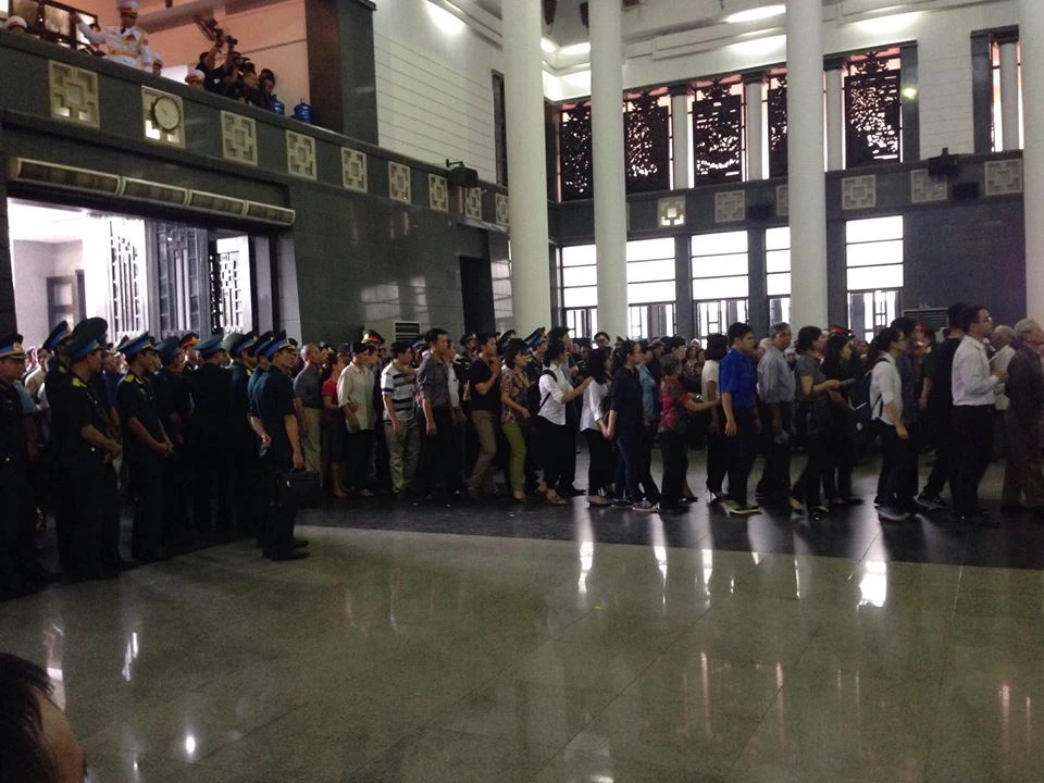 Mưa tạnh, Ban lễ tang thông báo do thời gian viếng có hạn nên các đoàn được vào viếng cùng lúc. Hàng trăm đoàn đại biểu đã xếp hàng dài từ cửa nhà tang lễ ra sân
