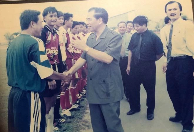 Nguyên Tổng bí Thư Nông Đức Mạnh động viên và chúc mừng HLV Nguyễn Trung Hậu khi dẫn dắt U-21 Gạch Đồng Tâm. Ảnh: TƯ LIỆU