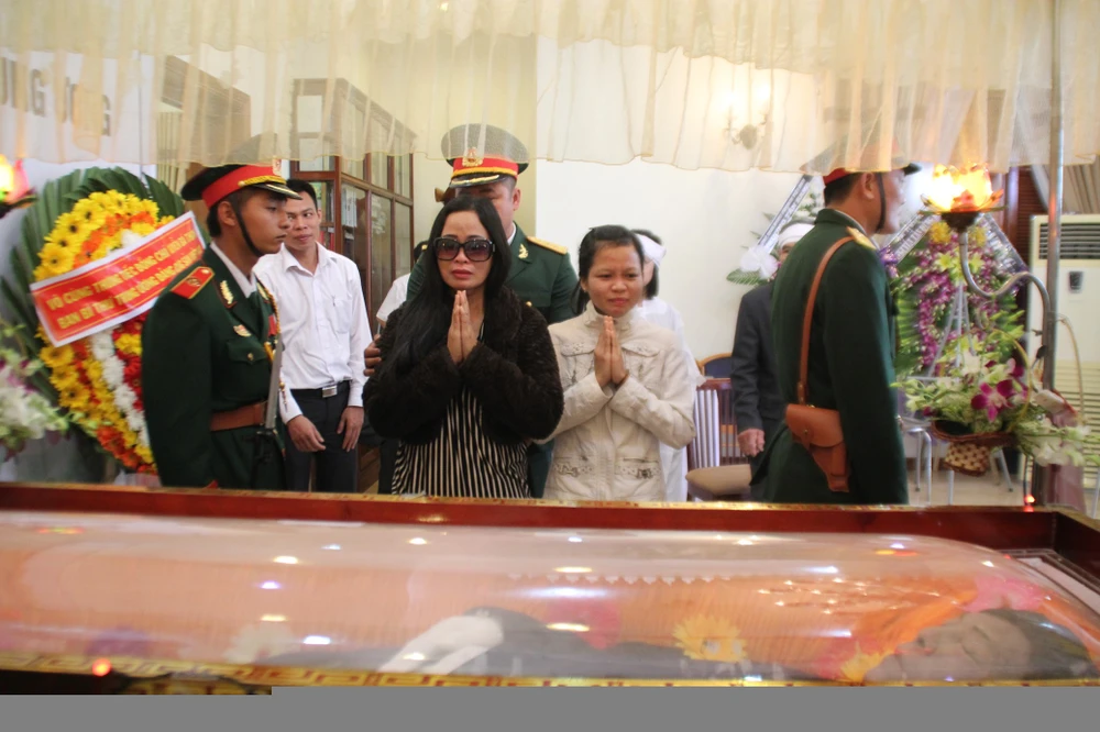 ảnh 1: Một cụ bà cúi đầu vái lạy bên vong linh ông Nguyễn Ba Thanh. LÊ PHI