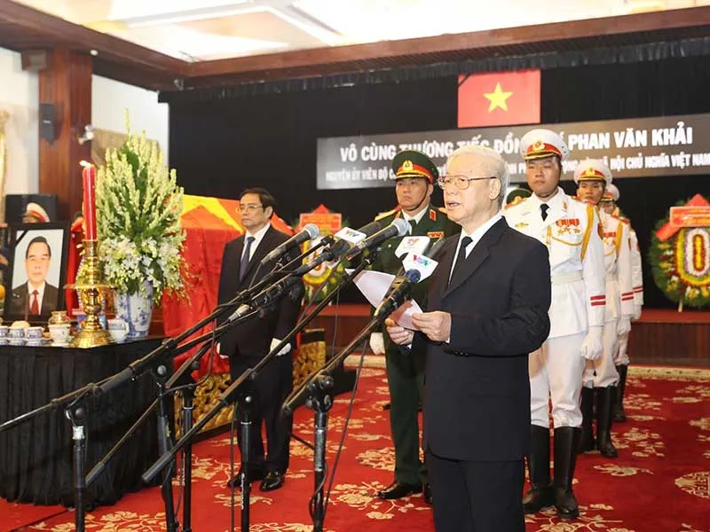 Trong gia đình, đồng chí là người chồng, người cha, người ông mẫu mực, đức độ và giàu lòng nhân ái”. Tổng Bí thư xúc động khi đọc lời điếu: “Hôm nay, chúng tôi có mặt tại đây để bày tỏ lòng tiếc thương vô hạn và tình cảm sâu sắc, tiễn đưa anh về nơi an nghỉ cuối cùng… Thưa anh Sáu Khải, anh ra đi nhưng hình ảnh và những cống hiến của anh cho sự nghiệp cách mạng của Đảng và dân tộc ta mãi mãi in đậm trong lòng cán bộ, đảng viên và nhân dân. Trong giờ phút tiếc thương và xúc động này, chúng ta xin trân trọng gửi đến toàn thể gia quyến đồng chí Phan Văn Khải lời chia buồn sâu sắc nhất trước nỗi đau thương mất mát không gì bù đắp được.