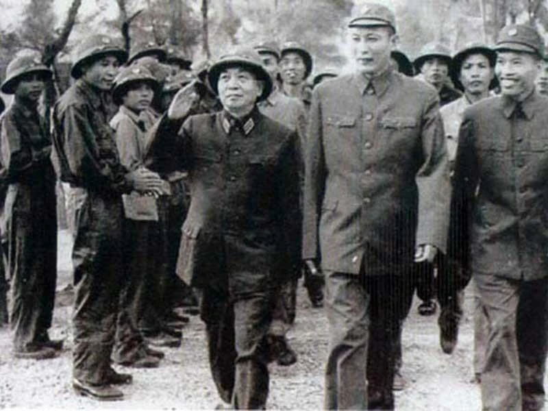Đại tướng Võ Nguyên Giáp cùng Tư lệnh Binh đoàn Trường Sơn Đồng Sỹ Nguyên đến thăm bộ đội Trường Sơn. Ảnh: TƯ LIỆU