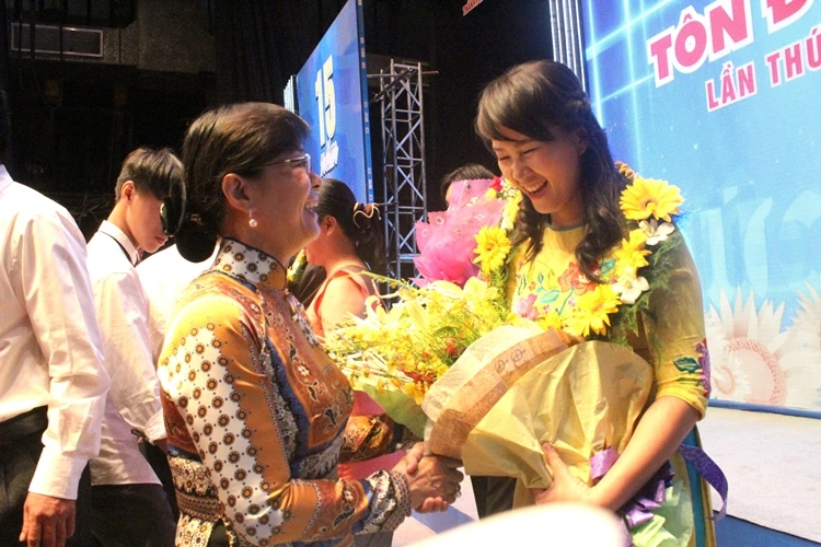 Chủ tịch HĐND TP Nguyễn Thị Quyết Tâm chúc mừng Trần Thị Hồng Vân (công ty Nissei Electric Việt Nam) – có 12 sáng kiến, tiết kiệm cho doanh nghiệp hơn 48 tỷ/ năm