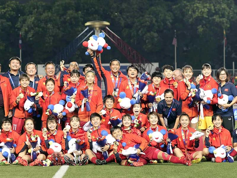 HLV Mai Đức Chung cùng các nữ tuyển thủ Việt Nam đón nhận chức vô địch SEA Games lần thứ sáu. Trước đó thầy trò ông đã vô địch AFF Cup. Ảnh: ANH PHƯƠNG