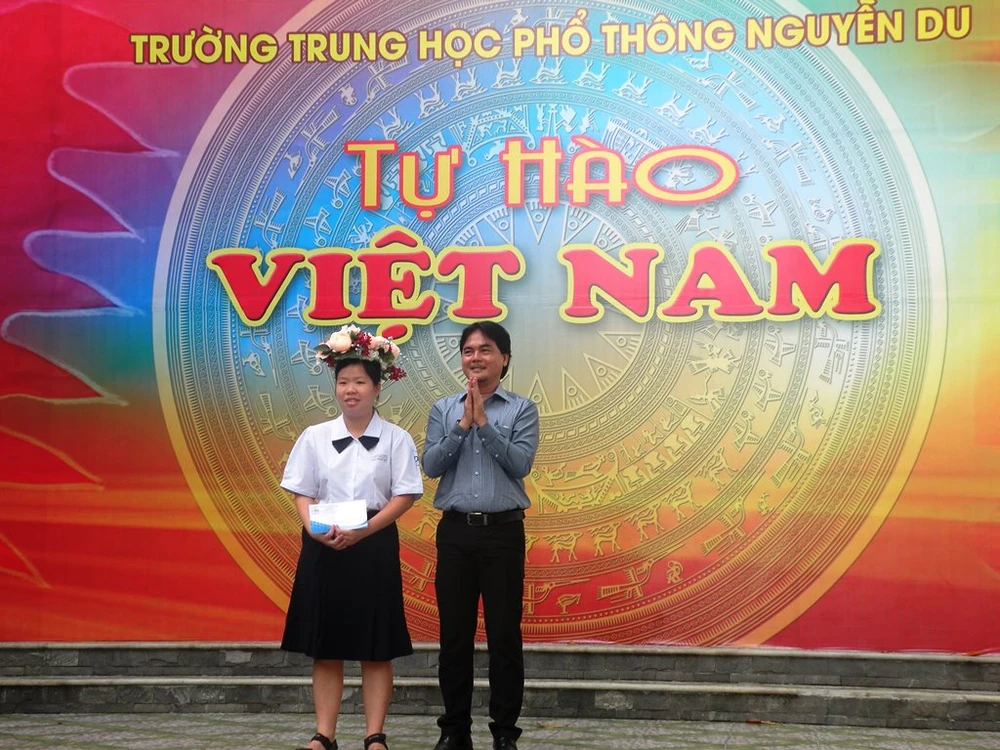Trường THPT Nguyễn Du tổ chức buổi lễ vinh danh em Nguyễn Ngọc Khánh đạt giải á quân cuộc thi "Tự hào Việt Nam". Ảnh: NGUYỄN QUYÊN