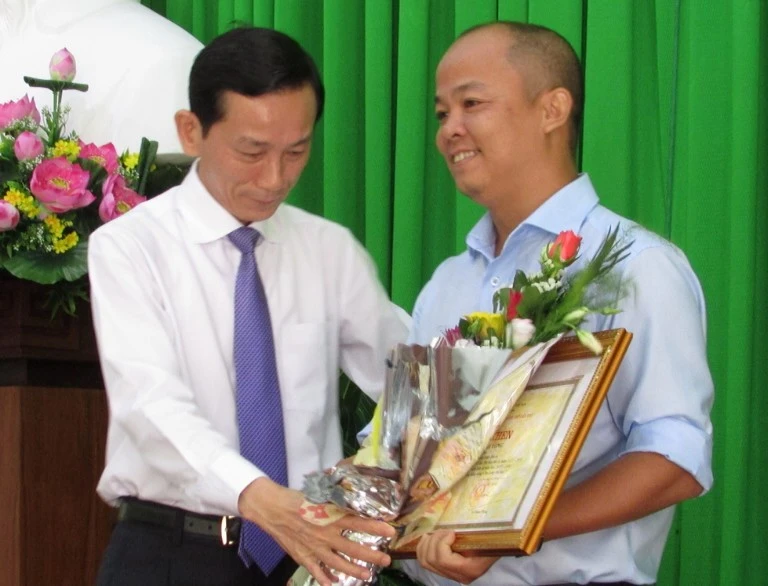 Chủ tịch UBND TP Cần Thơ Võ Thành Thống trao giải nhất thể loại báo in cho tác giả Lê Thành Long (Báo Cần Thơ) với tác phẩm "Hạn, xâm nhập mặn lịch sử mùa khô 2015-2016: Hành động ngay vì một ĐBSCL trù phú". Ảnh: N.NAM