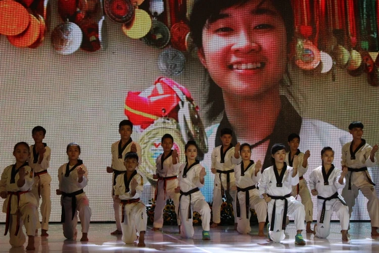 Công dân trẻ tiêu biểu Nguyễn Thị Mộng Quỳnh đang trình diễn một màn võ thuật Taekwondo cùng đồng môn