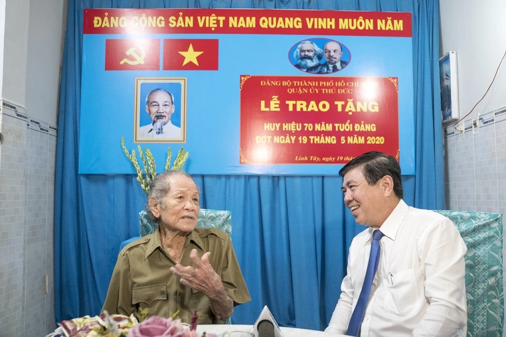 Ông Nguyễn Thành Phong đã có lời hỏi thăm sức khỏe, gửi lời chúc mừng đến vị cách mạng lão thành nhận huy hiệu 70 năm tuổi Đảng. Chủ tịch UBND TP.HCM cũng bày tỏ sự trân trọng trước những đóng góp rất ý nghĩa của ông Thâm đối với đất nước.