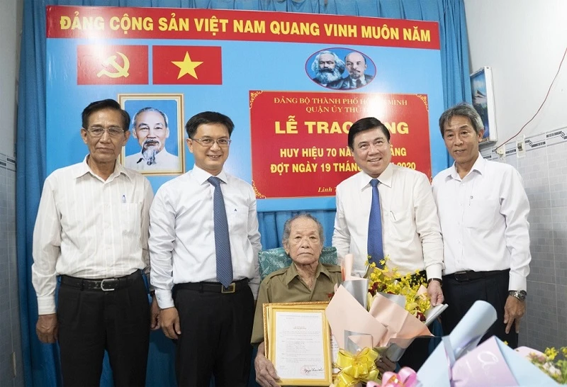 Chiều 19-5, Chủ tịch UBND TP.HCM Nguyễn Thành Phong đã đến nhà riêng, trao huy hiệu 70 năm tuổi Đảng cho ông Lê Hoàng Thâm (ngụ quận Thủ Đức).