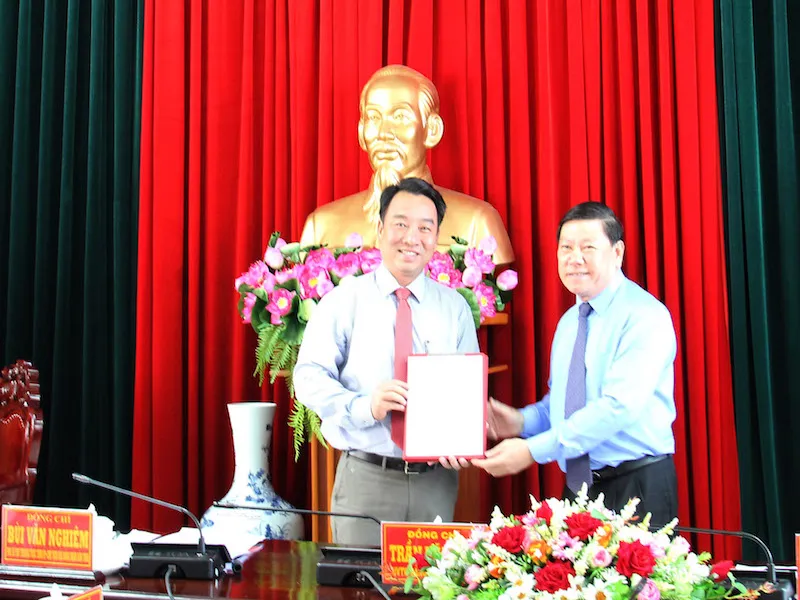 Bí thư Tỉnh ủy Vĩnh Long Trần Văn Rón trao quyết định chuẩn y cho ông Lữ Quang Ngời. Ảnh: Hải Dương