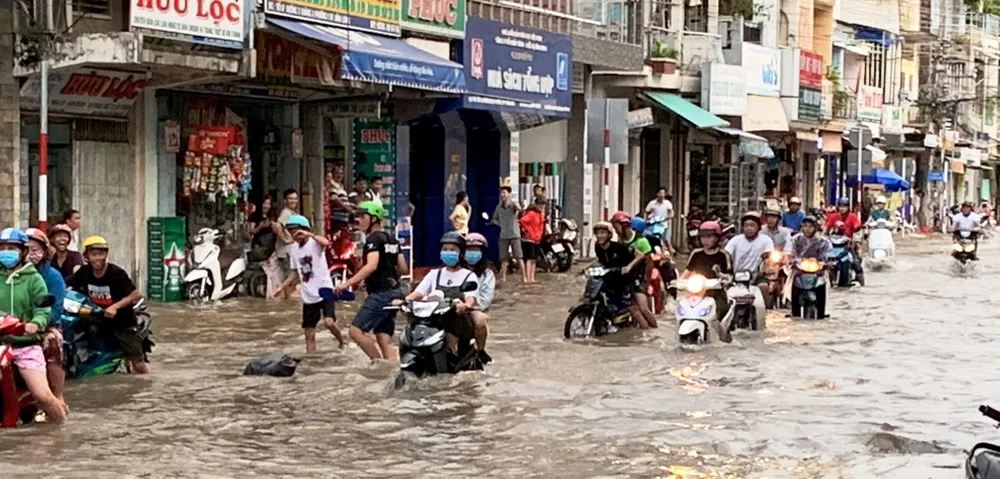 Chiều 29-9, hàng loạt tuyến đường nội ô TP Vĩnh Long, tỉnh Vĩnh Long bị ngập sâu khiến các phương tiện qua lại gặp rất nhiều khó khăn. Có những tuyến đường ngập sâu hơn nửa bánh xe.