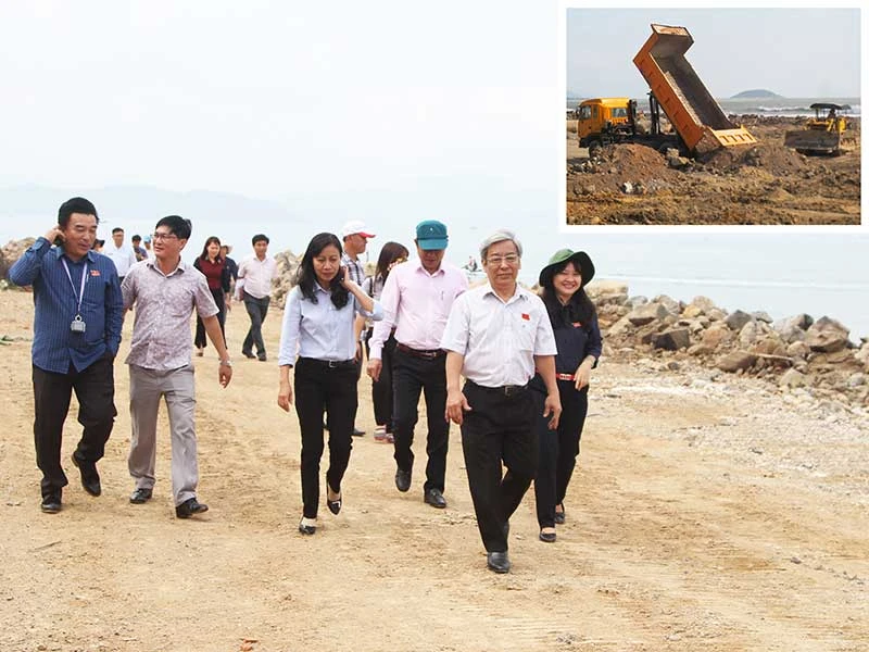 Đoàn khảo sát HĐND tỉnh Khánh Hòa ghi nhận thực tế tình trạng lấn biển trái phép. Ảnh nhỏ: Dự án Nha Trang Sao lấp, lấn biển trái phép, làm mất cảnh quan vịnh Nha Trang. Ảnh: KK - TẤN LỘC