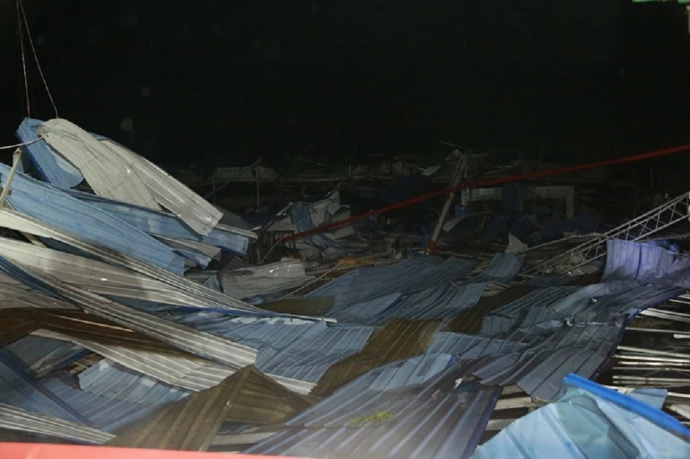 Chiều tối 10-6, lốc xoáy cùng mưa giông khiến khu nhà xưởng của Công ty TNHH MTV Kiều Thi Junma (Bình Xuyên, Vĩnh Phúc) đổ sập.