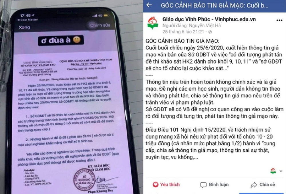 Ngày 25-6, học sinh này đã sử dụng các ứng dụng từ điện thoại thông minh của mình, tạo lập văn bản giả mạo của Sở bằng cách cắt, ghép, chỉnh sửa tạo ra nội dung thông báo học sinh khối 10, 11 phải thi lại do lộ đề. Sau đó nam sinh này đăng lên nhóm chat. Hai thành viên còn lại chia sẻ lên mạng.