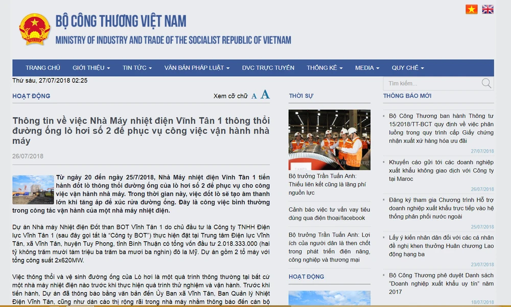 Thế nhưng, liên quan đến sự vụ này, ngày 26-7, trên trang web của Bộ Công Thương đã đăng thông tin về việc thông thổi lò hơi tại Nhà máy Nhiệt điện Vĩnh Tân 1. Thông tin này cho rằng việc thông thổi và vệ sinh đường ống của lò hơi là một quá trình thông thường tại bất cứ một nhà máy nhiệt điện nào trước khi thực hiện quá trình thử nghiệm và vận hành. “Đây là quá trình chủ động và được kiểm soát hoàn toàn đồng thời không có những ảnh hưởng tiêu cực đáng kể nào đến với môi trường", bản tin này cho hay. Dưới thông tin này ghi rõ Cục Kỹ thuật an toàn và Môi trường công nghiệp, Bộ Công Thương.
