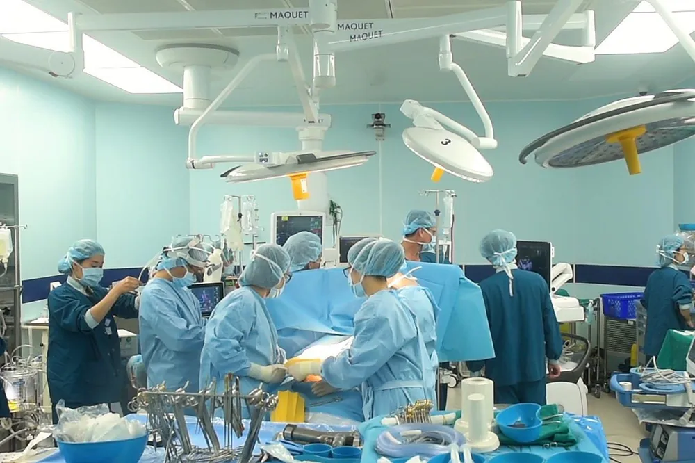 Với sự chuẩn bị kỹ lưỡng, ekip đa chuyên khoa Bệnh viện Vinmec Times City đã phối hợp nhuần nhuyễn trong suốt thời gian hơn 5 giờ phẫu thuật cấy ghép tim bán phần nhân tạo cho chị Vi Thị Tân.