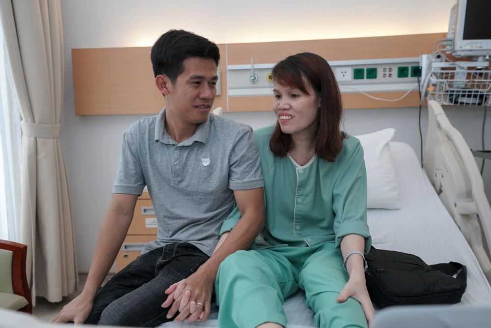 Nụ cười rạng rỡ của vợ chồng chị Vi Thị Tân trong ngày ra viện.