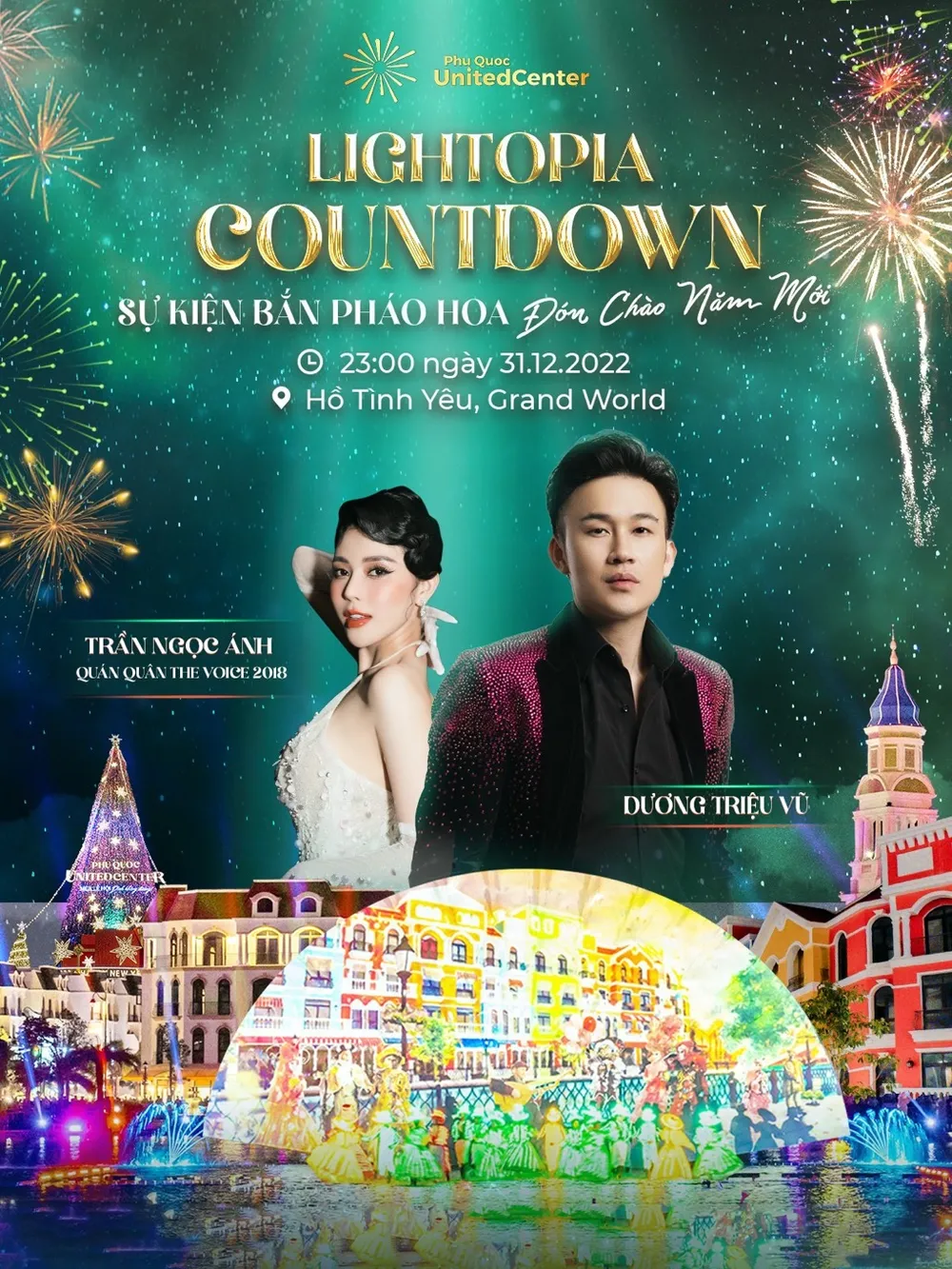 Tại trung tâm Grand World, đại nhạc hội trên mặt nước lấy cảm hứng “thành phố ánh sáng”, Lightopia Countdown sẽ được tổ chức trong khuôn viên Hồ Tình Yêu và mở cửa miễn phí cho hơn 5.000 du khách. Trần Ngọc Ánh (Á quân The Voice 2018) mở màn thăng hoa với khúc hát Ave Maria lừng danh trên chiếc thuyền Gondola từ giữa sông Venice, Dương Triệu Vũ, Thanh Duy Idol… cảm xúc và bùng nổ trên sân khấu nổi có người trình diễn duy nhất tại Việt Nam. Pháo hoa rực rỡ sẽ được bắn lên từ Tháp Hẹn hò, thắp sáng một vùng trời đảo ngọc.