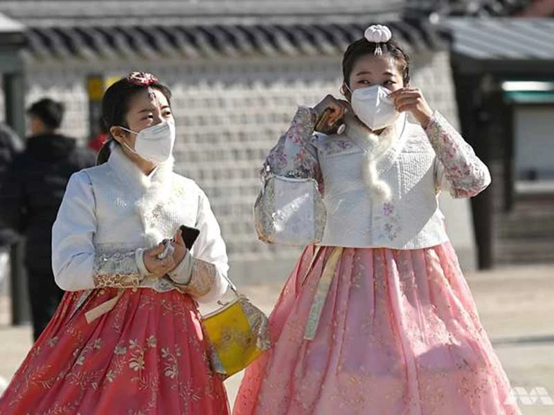 Thiếu nữ mặc trang phục truyền thống Hàn Quốc và đeo khẩu trang ngừa nhiễm virus Corona thăm cung điện Gyeongbokgung ở Seoul ngày 3-2. Ảnh: AFP