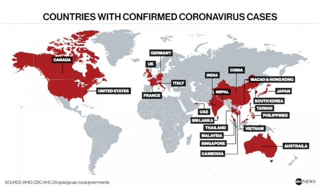 Bản đồ các khu vực hiện đã có người mắc bệnh do virus Corona gây nên. Đồ họa: ABC NEWS