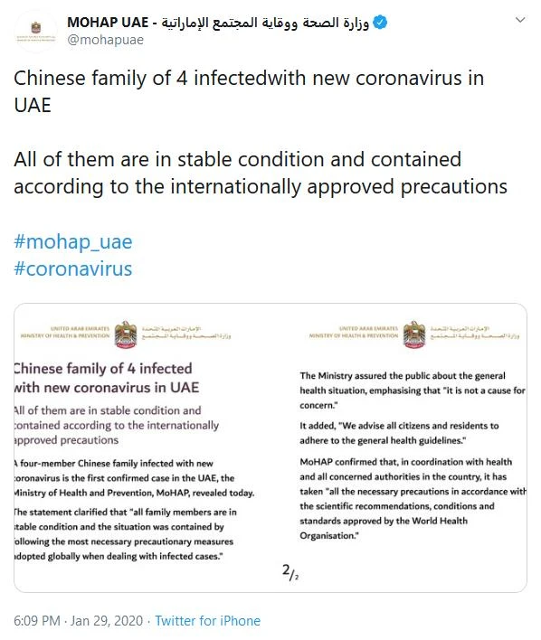 Thông cáo của Bộ Y tế Các Tiểu vương quốc Ả Rập Thống nhất về ca nhiễm đầu tiên tại nước này, khiến UAE trở thành quốc gia Trung Đông đầu tiên có ca nhiễm. Ảnh: TWITTER