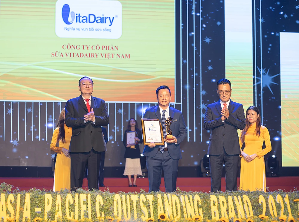 Theo đó, VitaDairy đã được xướng tên trong Top 10 Thương hiệu tiêu biểu châu Á - Thái Bình Dương 2021 tại lễ công bố vừa diễn ra tại TP.HCM. Chương trình được Tạp chí Kinh tế Châu Á – Thái Bình Dương tổ chức và được giám sát chất lượng bởi Hiệp hội Thông tin công nghiệp Châu Á – AIPA nhằm tôn vinh các thương hiệu uy tín, tiêu biểu, đầu ngành.
