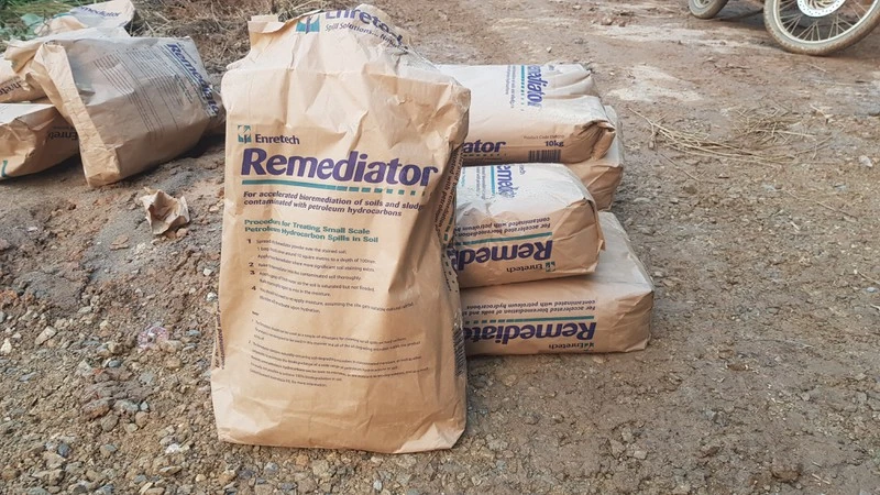 Chất vi sinh được sử dụng để phân hủy dầu còn lại trên mặt đất cũng như các hố chôn tập trung.