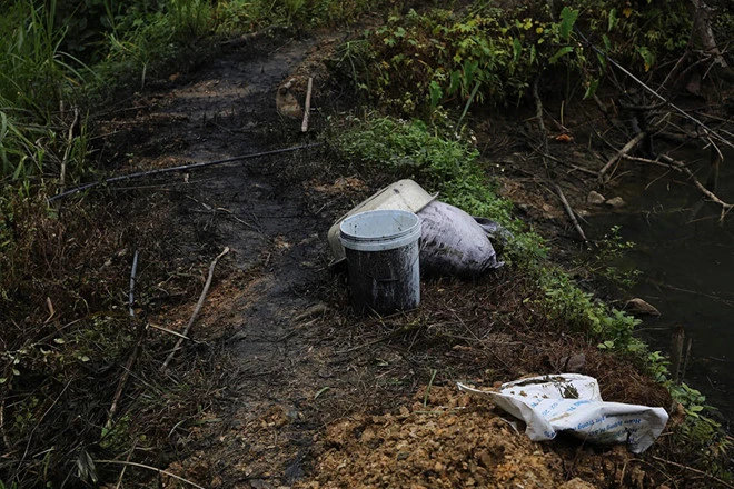 Vết tích dầu loang tại ven bờ suối Trâm, gần kênh dẫn nước vào nhà máy. Ảnh: BÁO THANH NIÊN