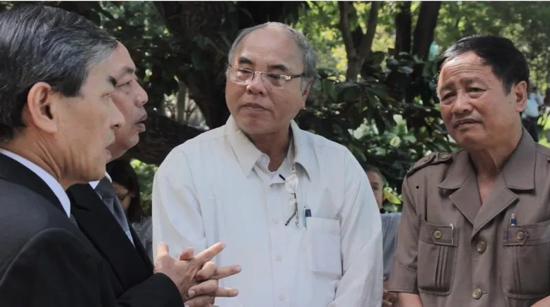 Ông Quyện (giữa) trao đổi với luật sư tại tòa ngày 4-9. Ảnh: PL