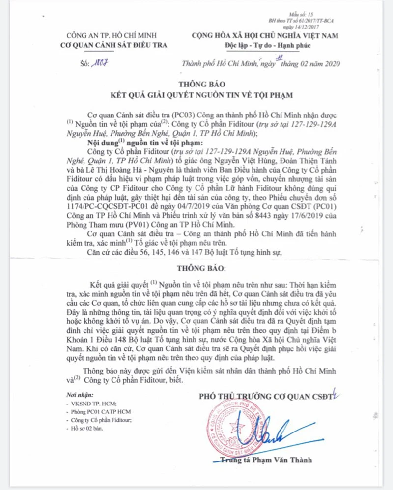 Ngày 11-2-2020, Cơ quan CSĐT Công an TP.HCM ra thông báo kết quả giải quyết nguồn tin về tội phạm. Cơ quan này cho rằng đang yêu cầu các cơ quan, tổ chức liên quan cung cấp các hồ sơ nhưng chưa có kết quả; đây là những thông tin, tài liệu quan trọng có ý nghĩa quyết định đối với việc khởi tố vụ án hay không. Do vậy, cơ quan CSĐT ra quyết định tạm đình chỉ việc giải quyết nguồn tin về tội phạm theo điểm b khoản 1 Điều 148 BLTTHS.