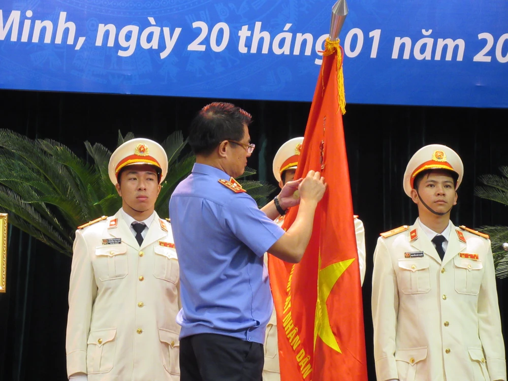Ông Nguyễn Huy Tiến trao Cờ thi đua của Chính phủ cho VKSND TP.HCM. Ảnh: YC