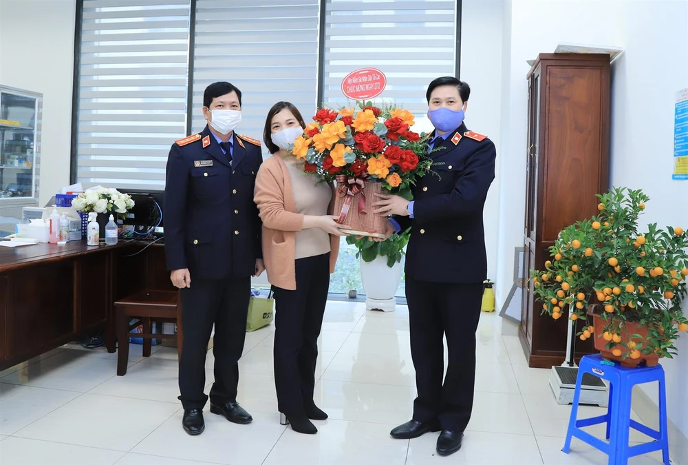 và lãnh đạo một số đơn vị thuộc văn phòng tặng hoa chúc mừng tổ y tế. Ảnh: Cổng Thông tin điện tử VKSND Tối cao