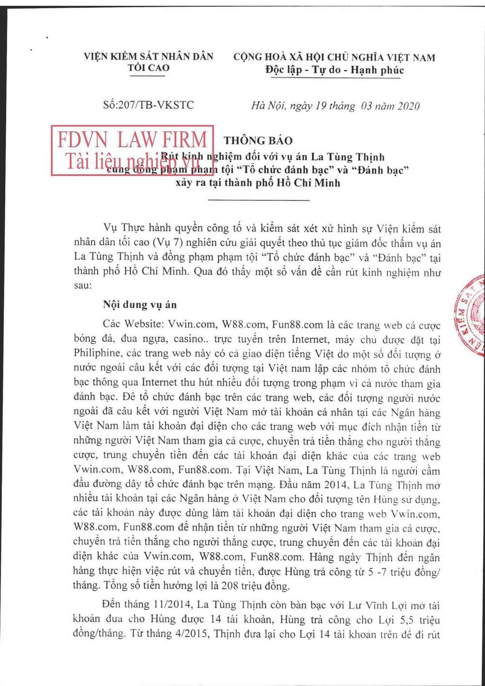 VKSND Tối cao vừa ban hành thông báo rút kinh nghiệm đối với vụ án La Tùng Thịnh cùng đồng phạm phạm tội tổ chức đánh bạc và đánh bạc xảy ra tại TP.HCM.