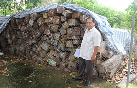 Ông Quách Phi Long bên lô gỗ bị Cục Điều tra chống buôn lậu - Tổng cục Hải quan tạm giữ 22 tháng nay tại Chi cục Hải quan Dinh Bà (Đồng Tháp). Ảnh: N.ĐỨC