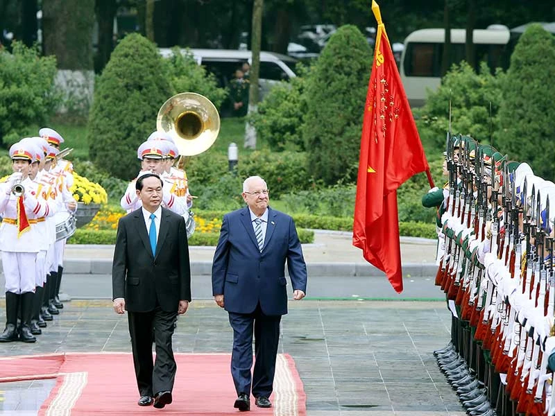 Chủ tịch nước Trần Đại Quang và Tổng thống Reuven R. Rivlin duyệt đội danh dự Quân đội nhân dân Việt Nam. Ảnh: TTXVN