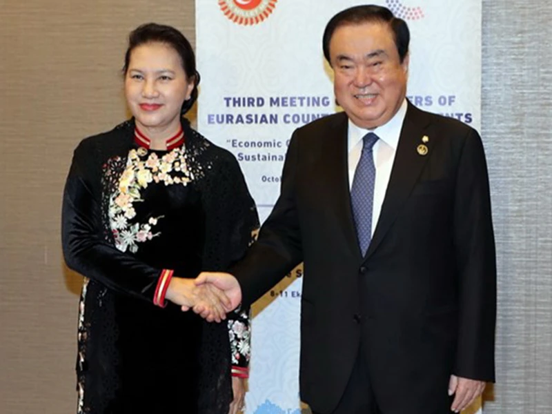 Chủ tịch Quốc hội Nguyễn Thị Kim Ngân hội kiến Chủ tịch Quốc hội HQ Moon Hee-sang bên lề Hội nghị chủ tịch Quốc hội các nước Á-Âu lần thứ ba (MSEAP 3) tháng 10-2018 ở Antalya (Thổ Nhĩ Kỳ). Ảnh: TTXVN
