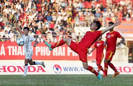 Công Vinh sau nhiều lần bỏ lỡ cơ hội đã ghi được bàn thắng giải hạn. Ảnh: QUANG THẮNG