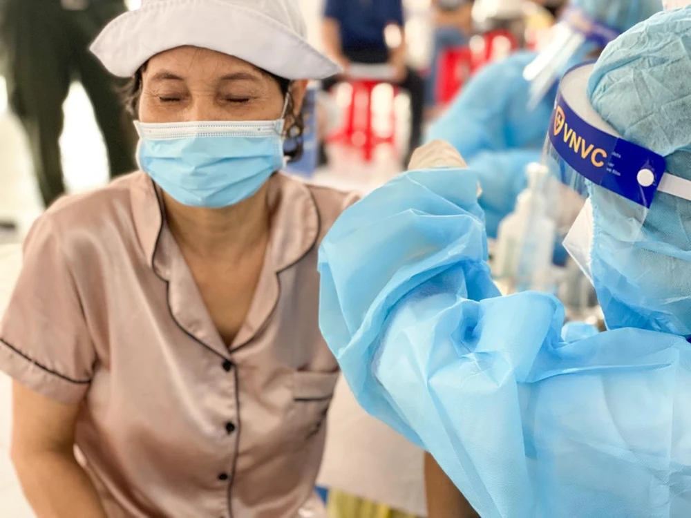 Người dân ở khu dân cư Thái Bình, TP Thuận An, Bình Dương được nhân viên VNVC tiêm chủng ngày 5-8. Ảnh: PL