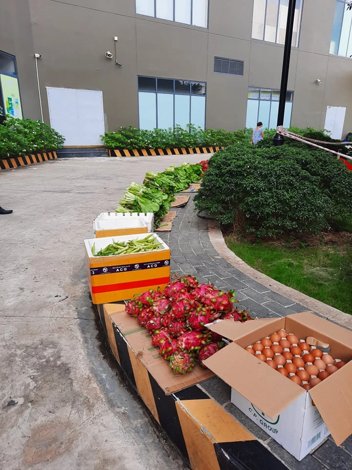 Hiện tại, chung cư có 2 lầu bị phong tỏa do có F0. Rau, củ, gạo và thực phẩm được chị Anh và mọi người ưu tiên cho 2 lầu bị phong tỏa trước, sau đó đến các căn hộ khó khăn hơn. Nhiều người trong chung cư cũng giúp chị chia phần, đưa thực phẩm xuống sảnh và tới các căn bị phong tỏa. Người đưa thực phẩm tới những nơi bị phong tỏa đều được trang bị đồ bảo hộ và xịt khuẩn.