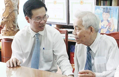 Phó Bí thư Thường trực Thành ủy TP.HCM Võ Văn Thưởng hỏi thăm sức khỏe ông Nguyễn Đức Cang. Ảnh: TÁ LÂM