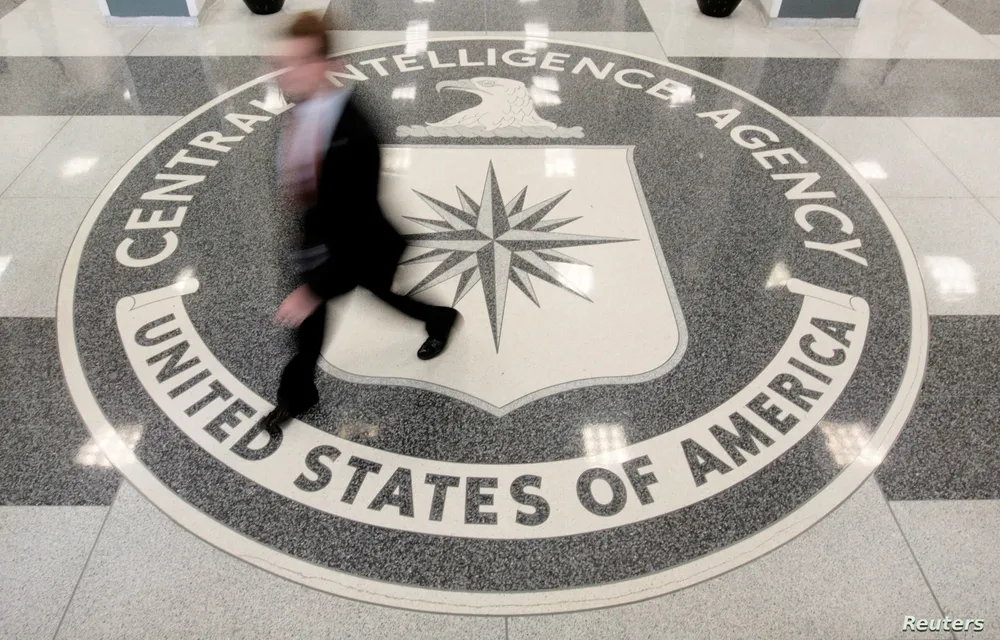 Một người đàn ông đi qua logo của Cơ quan Tình báo Trung ương Mỹ (CIA). Ảnh: REUTERS