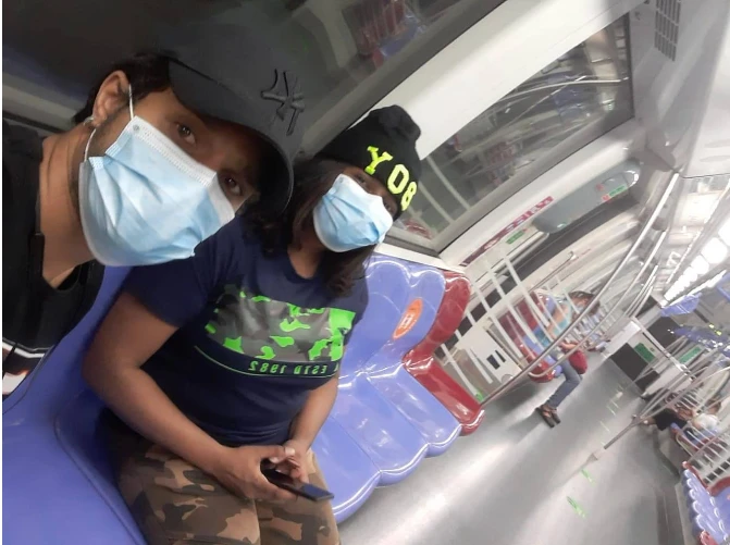 Hai vợ chồng Brahim Casseem và Dilka Dilukshi trên một chuyến tàu lửa vắng người mùa COVID-19 ở Singapore. Ảnh: Brahim Casseem/CNA
