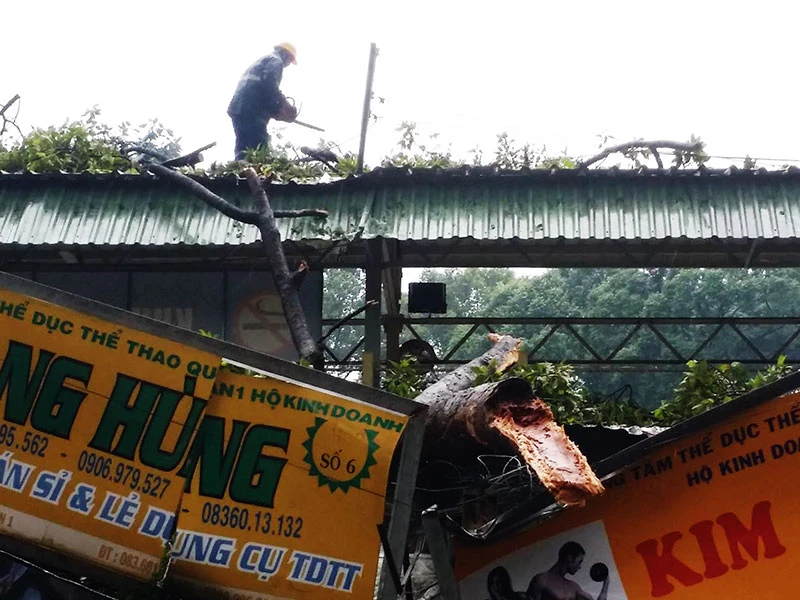 Nhánh cây cổ thụ gãy rơi xuống trúng mái nhà của cửa hàng kinh doanh dụng cụ thể thao. Ảnh H. Tâm.