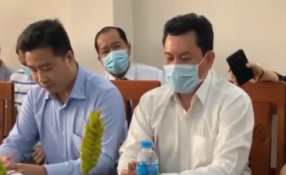 Ông Võ Hoàng Yên (áo trắng, phía trên) phủ nhận những tố cáo đối với bản thân về việc lừa đảo, chiếm đoạt tài sản. Ảnh cắt từ clip báo Người Lao Động