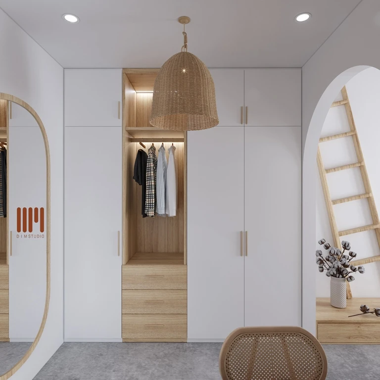 Gam màu chủ đạo của không gian phòng ngủ là màu gỗ và màu trắng.