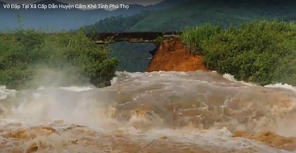 Đập chứa nước Đầm Thìn (xã Cấp Dẫn, huyện Cẩm Khê Phú Thọ) bất ngờ bị vỡ khiến một lượng nước lớn tràn xuống dưới hạ du. Trưa 28-5, trao đổi với PLO, bà Nguyễn Thị Bạch Kim, Chi cục phó Chi cục Thủy lợi, thuộc Sở NN&PTNT Phú Thọ, xác nhận thông tin trên.