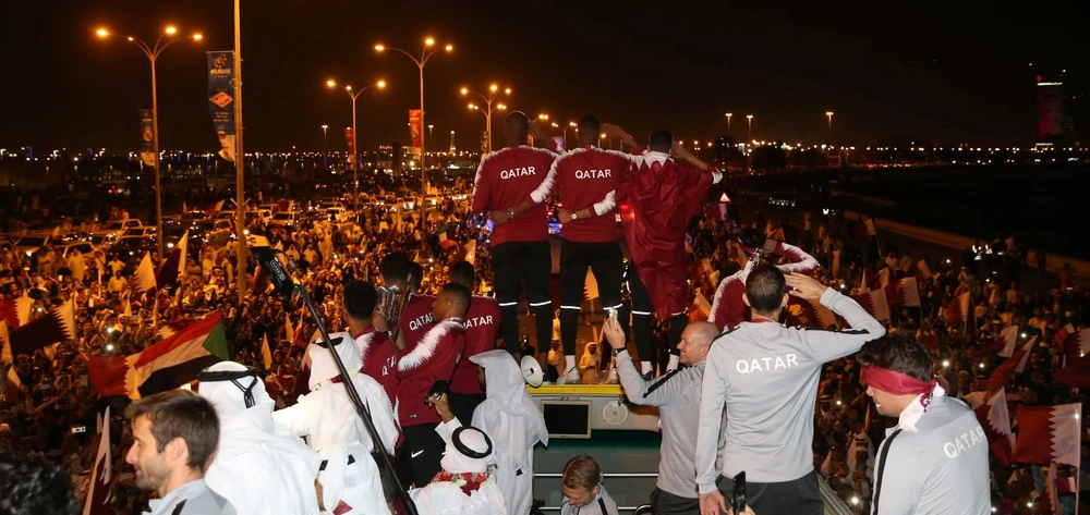 Tuyển Qatar tuần hành ăn mừng ngôi vô địch châu Á khi từ UAE trở về Doha