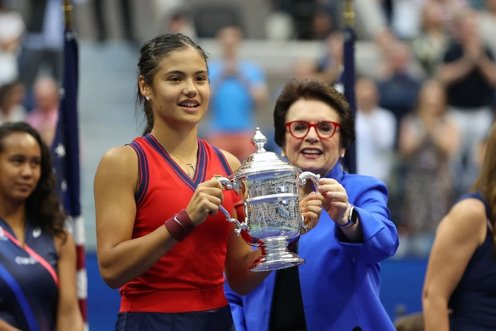 Raducanu nhận cúp vô địch từ huyền thoại người Mỹ Billie Jean King. ẢNH: GETTY