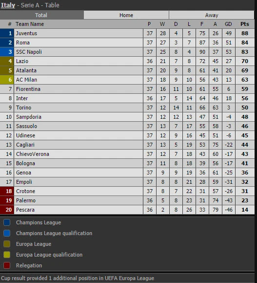 Sau vòng 37 Serie A, mọi cuộc đua tranh đã gần như an bài. Juventus chính thức vô địch trước 1 vòng đấu. Juve sẽ cùng với Roma và Napoli dự Champions League mùa tới. Roma và Napoli còn cạnh tranh nhau vị trí thứ 2 và 3 để tránh suất đá vòng loại Champions League.