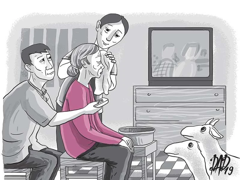 Buổi sáng, ông Tài lùa bầy dê ra rẫy chăn. Chúng nó đi đâu ông theo đó, sợ nó vào phá tiêu, phá đậu nguời khác. Nửa buổi ông lùa bầy dê về vườn điều gần nhà, nhờ ai đó trông giùm vài phút rồi về nhà… chuyển kênh tivi cho vợ vì đang có chương trình bà thích. Vợ ông hỏi: “Anh về rồi bầy dê ai coi?”. Ông Tài trả lời: “Về mở phim cho em coi rồi anh ra rẫy chăn bọn hắn”.